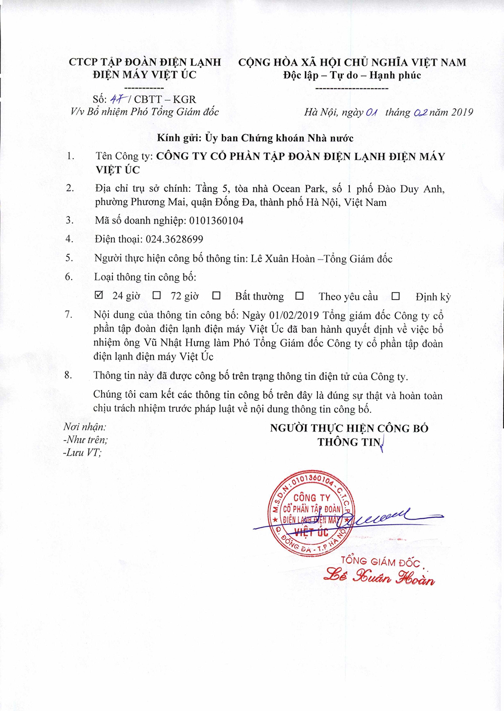 CBTT về việc bổ nhiệm Phó Tổng Giám đốc