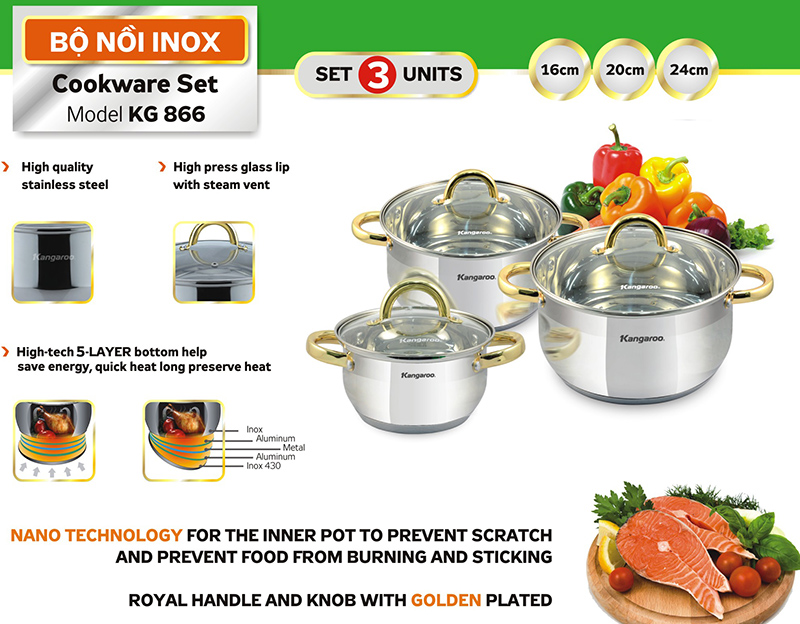 Cookware set KG 866 has 3 pots with different dimension of 16cm, 20cm and 24 cm, a necessary item for your kitchen space thanks to its high quality and function.